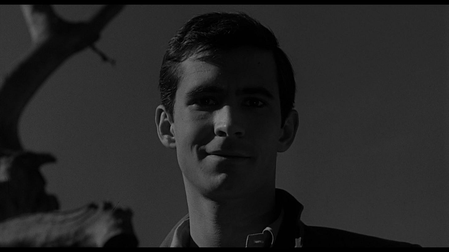 I've sometimes told coworkers that International Delights hazelnut flavored non-dairy creamer is “a poor substitute” for half & half, and said as much while pouring International Delights hazelnut flavored non-dairy creamer into a cup of coffee. Anthony Perkins delivers the line with premeditated immediacy, as though he has drawn this conclusion from years of experience. The “poor substitute” line occurs in a room full of taxidermied birds, Norman's hobby which passes the time. He compares the way Marion eats a sandwich to a bird, and in the same way an eye accustomed to dark must slowly adjust to light, the audience gradually recalls Marion's last name is Crane, doubly identifying her with the dead things Norman stuffs. It's not enough to have Norman possess his mother's name, Norma; Hitchcock also reflects Marion's name into the Bates family. “Marion” is nearly a letter-for-letter inversion of “Norma”. Why does Marion run? Hitchcock aesthetically shapes Marion until the poetry of film won't not let her end up dead at the Bates Motel. She slips into the place, into death at Norman's hands, with scientific ease.